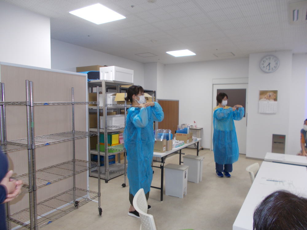 訓練では、病院スタッフの方によるPPE(個人防護具)の着脱方法などを参考に、さざんか荘でも感染症がいつ発生しても迅速に対応できるよう、一連の流れをシミュレーション形式で再確認しました。