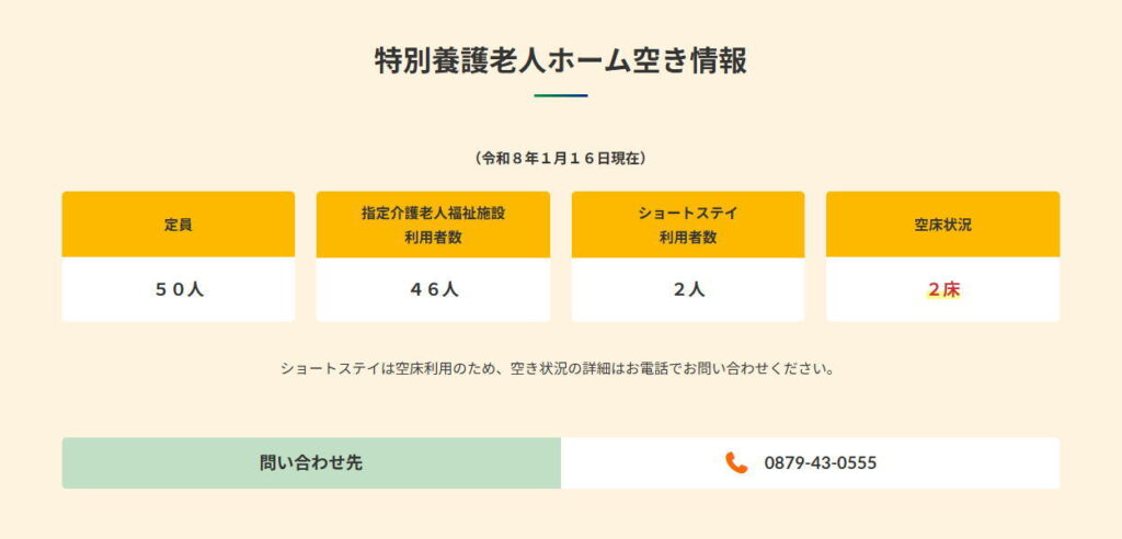 さざんか荘のトップページにおいて、特別養護老人ホームの最新の空き状況(空床数)をご覧いただけるようになりました。